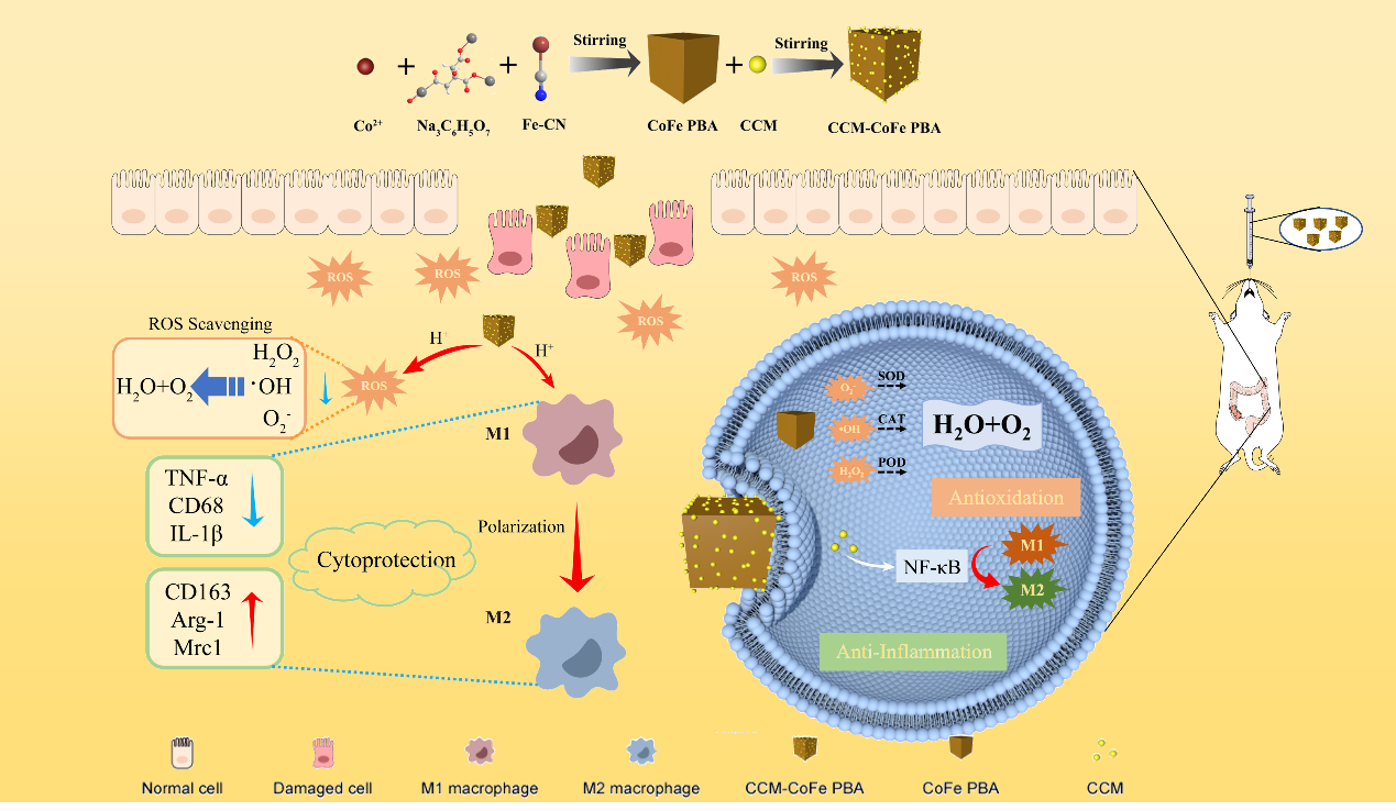 Co(III)和Fe(II)具有丰富的价态变化,CCM-CoFe PBA中的低氧化还原电位使其通过多种酶活性清除ROS,如•OH和H2O2。修饰的CCM可以在酸性组织环境(pH<7.0)中释放,最终导致M2巨噬细胞的形成和抑制性促炎因子的分泌。在DSS诱导的UC小鼠体内实验表明,纳米杂交体可以有效缓解症状并抑制疾病的进展。