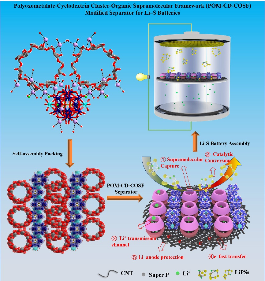 锂硫(Li-S)电池因具有超高理论能量密度(2600Whkg-1)、且地壳中硫储量丰富,价格低廉、环境友好等特点,被认为是最具潜力的下一代高性能储能设备之一。然而,由于硫的氧化还原反应动力学缓慢、多硫化物(LiPSs)溶解于电解液所造成的穿梭效应、以及金属锂阳极腐蚀和枝晶生长等问题严重限制了其商业开发。近年来,本课题组发现将具有“电子海绵”特性的Keggin型多金属氧酸盐(Polyoxometalate, POM)分子簇催化剂引入锂硫电池系统,可以实现S-Li2S物种的双向催化转化 (ACS Nano 2021, 15, 12222-12236. DOI:10.1021/acsnano.1c03852)。 但是,在锂化过程中所形成的还原性的“杂多蓝”物质易溶解于电解液中,造成硫阴极中多酸催化剂的流失。因此,多酸分子簇应用于锂硫电池所面临的关键难点在于寻找适合的多酸结构,并同时实现其在电池系统内的有效锚定。构建超分子/多酸有机无机杂化自组装框架材料,不仅可以有效固定多酸催化剂,还可以利用超分子主客体识别作用捕获多硫化物和电解质分子,从而抑制穿梭效应并提升锂离子的传输。 在此之前,本课题组也已经将环糊精作为功能超分子宿主材料成功应用于Li-S 电池系统中 (Energy Storage Mater., 2019, 21, 378-389. DOI: 10.1016/j.ensm.2018.12.002)。 但是,目前将多酸无机分子簇(POM)和环糊精(Cyclodextrin,CD)有机超分子主体这两种不同的性质构建单元结合并实现合理自组装,制备出结构新颖的多酸-环糊精团簇-有机超分子框架晶态材料(POM-CD-COSF)仍然是一项极其艰巨的任务。