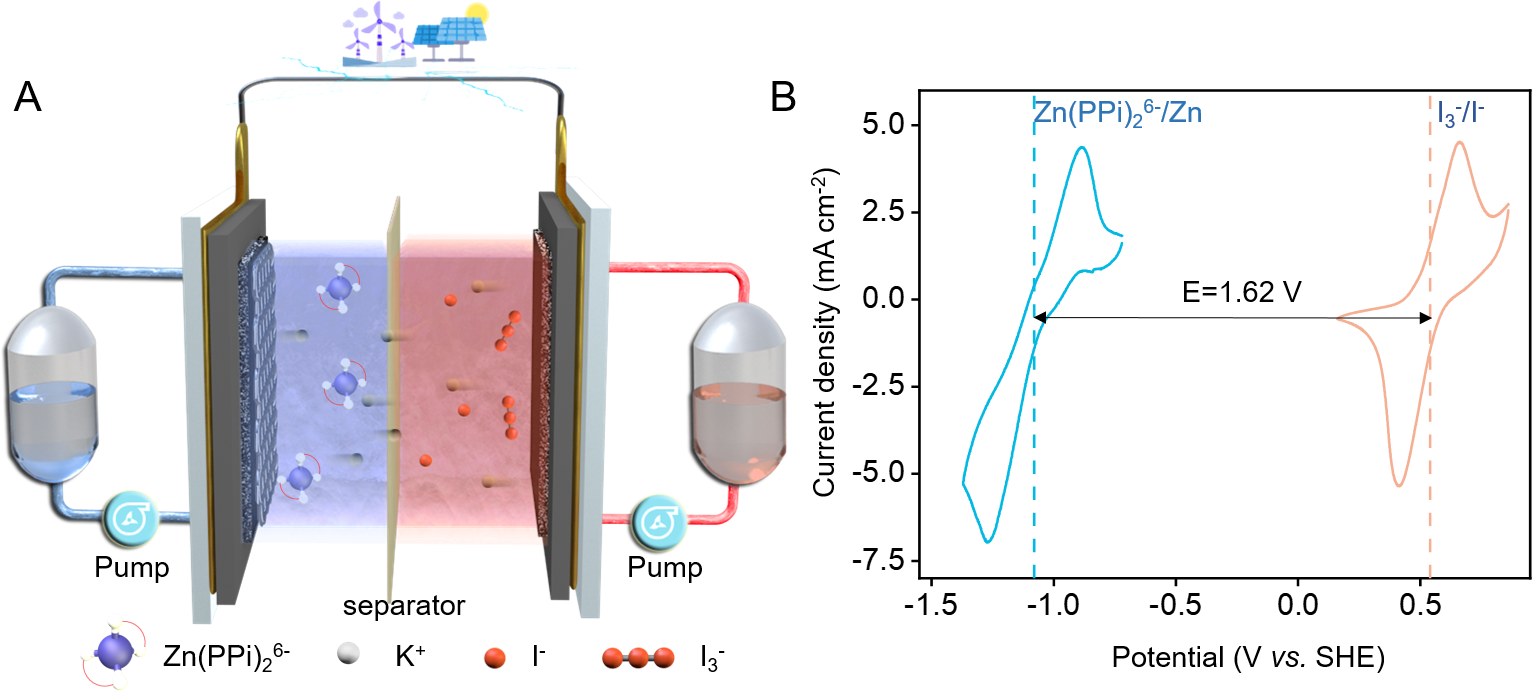 近日,扬州大学青年教师王财兴联合复旦大学王永刚教授开发了一种新颖的Zn(P2O7)26-的负极电解液,简称为Zn(PPi)26-,并被用于ZIFBs。实验数据和理论计算结果表明,基于Zn(PPi)26-的负极电解液不仅能够促进无枝晶的锌沉积过程,还能有效阻止锌离子的交叉扩散。值得注意的是,Zn(PPi)26-电解液的沉积/剥离电位相比于Zn2+/Zn可负移至-1.08 V(vs. SHE),从而使得构筑的ZIFB电压增加至1.61 V。与传统ZIFBs 相比,电池电压增加了24%。此外,这种ZIFB表现出良好的稳定性,在200 mA cm-2的高电流密度下能够稳定循环超过250次,功率密度高达606.5 mW cm-2。该研究成果发表在Nat. Commun.上,第一作者为扬州大学王财兴助理研究员。