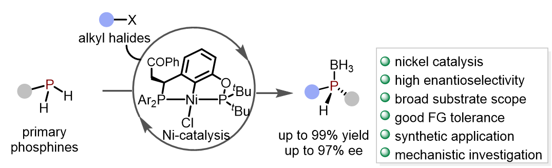 近日,扬州大学王传勇、郭建东和内蒙古大学段伟良合作报道了一种的合成P(III)-膦手性化合物的新方法。首先,他们通过使用手性三齿钳形镍配合物作为催化剂,实现了一级膦和卤代烷烃的不对称烷基化反应,以高对映选择性合成得到了一系列二级膦手性化合物。该类反应表现出了优异的立体选择性、反应可扩展性和良好的官能团耐受性等特征。随后,他们利用苯基膦与碘甲烷的不对称反应,克级规模的制备了苯基甲基膦手性化合物。该化合物作为典型的砌块分子,通过与卤代烷烃的亲核取代反应及与卤代芳烃的偶联反应,得到了一系列具有潜在应用价值的三级膦手性化合物。最后,他们通过DFT计算获得了镍膦物种中间体的翻转能垒,分析了反应立体选择性决定步骤,以此推测了反应可能的机理。
