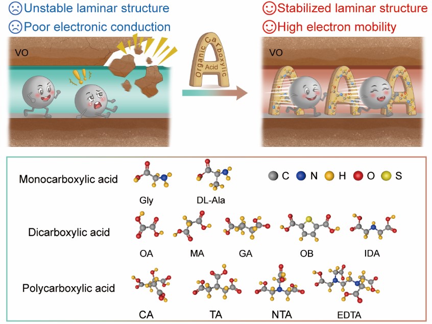 水系锌离子电池(AZIBs)因其高安全性、低成本、高理论比容量和低氧化还原电位而成为有前途的能量存储设备。作为AZIBs阴极材料,锰氧化物(MO)、钒氧化物(VO)和普鲁士蓝类似物(PBA)受到了广泛的研究。尽管VO因其多价态和复杂晶体结构而备受研究人员关注,但由于其二维层状结构存在间距小、易坍塌和离子导电性差等问题。同时,充放电过程中Zn2+的静电排斥和高水合作用也导致电化学动力学缓慢。为了提高AZIBs的性能,研究人员探索了通过插层来稳定VO纳米层结构、增加层间距和改善离子迁移率的方法。尽管金属离子插层可以扩大层间距,但可能引起结构不稳定,而有机分子插层则被证明可以增大层间距、稳定层间结构并加速动力学反应,同时提供活性位点外的功能基团,有助于改善循环性能。尽管如此,带电荷有机配体作为插层客体的作用尚未被充分研究,而这项研究正是针对这一领域,探索了带电荷有机配体插层优化VO性能的新途径。