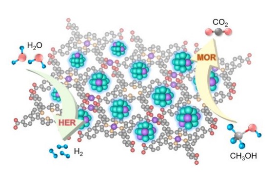 近日,扬州大学庞欢团队的皮业灿副教授报道了将各种 MNPs 加入二维共轭 MOF 超薄纳米片(Cu-TCPP UNS)基质的一般合成方法,这种方法不仅能防止 MNPs 团聚并限制其生长,还有利于活性位点的暴露和电子的传输。具体而言,所获得的 PtCu@Cu-TCPP UNS 在甲醇氧化反应(MOR)中的质量活性比商用 Pt/C 催化剂高出近两倍。机理研究表明,MNPs 与 Cu-TCPP 之间的强相互作用促进了 CO 中间体的氧化。此外,PtCu@Cu-TCPP UNSs 可用作双功能电催化剂,将甲醇氧化反应与氢析出反应结合起来,实现高效制氢。