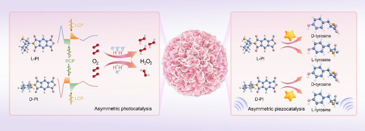 近日,扬州大学韩杰教授、于洪鉴博士和中国地质大学(北京)黄洪伟教授、刘金刚教授合作报道了一种由均苯四甲酸二酐与脂环族手性二胺聚合制得一种新型手性聚酰亚胺(PI)催化剂,无需导向剂或模板,具有本征手性,在手性依赖光催化和压电不对称催化中都展现出优异的性能。在CPL照射下,PI催化剂表现出手性依赖的光催化双氧水合成,对左圆偏振光(LCP)和右圆偏振光(RCP)有不同偏好。在超声振动下,手性PI催化剂对于压电催化酪氨酸分子转化表现出对映选择性。这一研究为有机手性催化材料在新型不对称催化中的深入探索提供了有价值的参考,并且为多种能量形式耦合驱动不对称催化的未来发展提供了基础。该研究成果以“Chiral Polar Bifunctional Polyimide Enantiomers for Asymmetric Photo- and Piezo-Catalysis”为题发表在高水平期刊Angewandte Chemie International Edition上,中国地质大学(北京)和扬州大学联合培养博士研究生张燕和扬州大学硕士研究生孙叶蒙为共同第一作者。