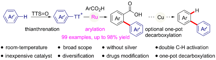近日,扬州大学化学化工学院张国栋博士与德国波鸿鲁尔大学Lukas Gooßen教授合作,成功开发出一种基于钌催化的室温高效合成联苯化合物的新方法,有效攻克了传统C-H活化反应中存在的高温条件、昂贵成本和导向基团限制等关键性难题。这项研究不仅显著降低了联苯化合物的合成成本和能源消耗,更为复杂药物分子的精准修饰提供了全新的研究工具。