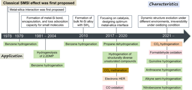 多相催化反应大多发生在纳米颗粒表/界面,因此精准调控纳米颗粒表界面结构对催化性能的调控至关重要。传统思路认为载体只负责分散金属粒子,但自从Tauster 等人在1978提出 “金属—载体强相互作用(SMSI)”改变了这一认识:高温还原过程,可还原氧化物载体(TiO2、CeO2等)会迁移到金属颗粒表面并形成包覆层,同时形成新的金属-金属,显著调变电子与几何结构,从而调控催化剂活性、选择性、以及稳定性。而且该效应在氧化氛围下具有可逆性。然而,SiO2载体因难以被还原,被认为难以形成类似效应,长期被工业界赋予“惰性”。近年来,随着球差电镜、同步辐射等表征手段进步,使科学家首次捕捉到SiO2在更高温度下(如750 °C)同样能迁移、并形成包覆层,甚至形成金属硅化物。这些发现打破了SiO2 “惰性”定论。然而该方面的研究缺少系统梳理,更无人回答“界面重构究竟怎样影响催化性能”这一核心问题。