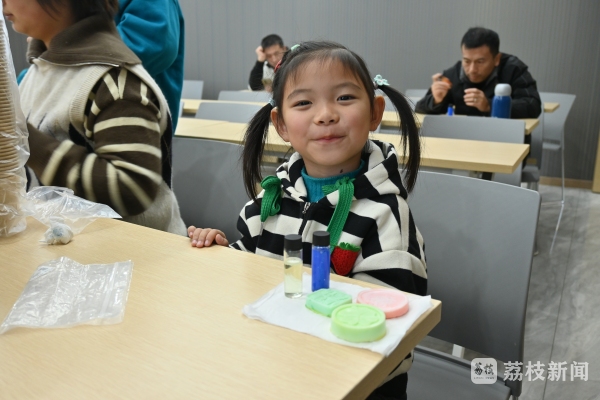 “小朋友,手工皂其实就是油、碱、水三者混合发生的自然化学反应。在日常生活中,你们看到的香皂还有不同颜色,你们猜猜是怎么回事呀?”大一新生,来自化教2401孙冉霏正耐心地引导小朋友们思考。