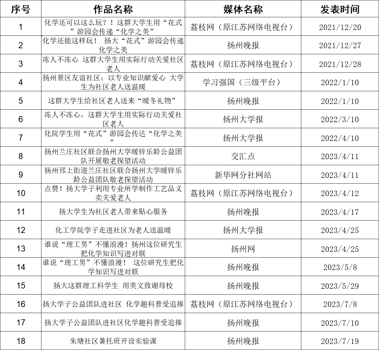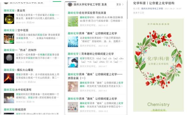 新媒体宣传是放大科普服务成果的重要载体,一直以来,为营造浓厚氛围,学院充分依托官微积极传播科普正能量,针对师生们的科普活动积极推送,取得了良好的社会影响,相关事迹被学习强国、荔枝网、交汇点、扬州晚报等各级媒体予以报道,同时,为传递更多的化学知识,平台还设立“趣味化学”“化学科普”“趣味实验”系列专栏推送。