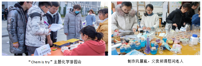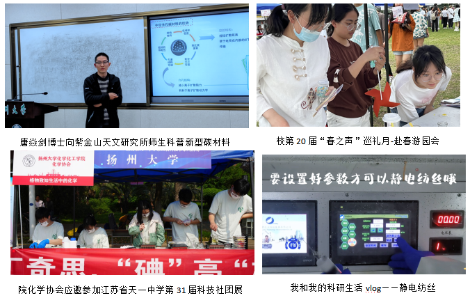 截至今日,学院依托学生组织在校园、社区开展20余次线下科普活动。如,自2019年以来,由院化学协会承办的“Chem is try”主题化学游园会是化学化工学院学生工作“一院一品”的品牌活动,至今已是第四届,始终以化学的趣味性特征为中心,以化学的学术性辅之,通过“沉浸式”体验展现化学的独特之“美”,激发学生学习化学的兴趣。自2021年以来,由院科协开展的“暖‘锌’乐龄”系列公益活动,利用专业特长制作手工制品,共吸引来自各个校区的1000余名学生预约、购买,义卖所得走进社区慰问老人,并普及生活中的化学知识,在关爱和丰富老人精神世界的同时,传递化学美。今年上半年,化学协会应邀前往无锡参加江苏省天一中学第31届科技节社团展;唐焱剑博士向紫金山天文研究所师生科普新型碳材料的奥秘。在活跃校园文化生活的同时,也培养了学生学习探索精神,增强专业自信;在研究生中开展“我和我的科研生活vlog”活动,向更多人展示化学科研的日常。
