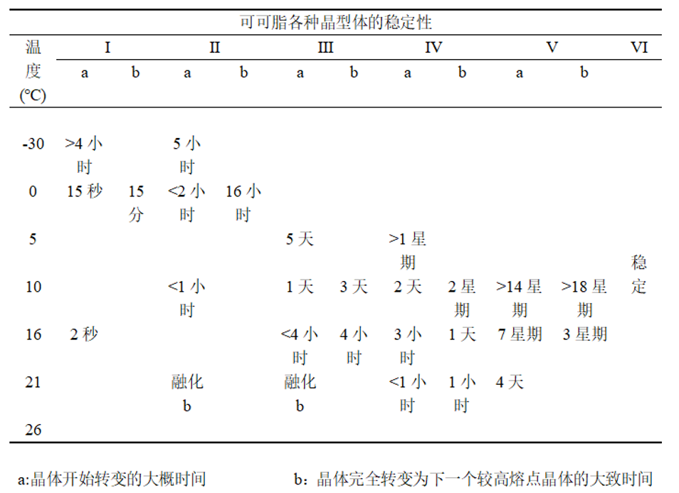 可可脂具有典型的同质多晶特性,即同种分子可形成结构不同但化学组成相同的6种晶型(Ⅰ-Ⅵ型),不同晶型的热力学参数差异显著,也决定了巧克力的品质表现。这些晶型的热力学稳定性按Ⅰ至Ⅵ型依次递增,呈现出熔点与熔化热同步升高的规律,反映了分子排列规整度与晶格能量的递进关系。其中Ⅴ型结晶因兼具适中的熔点(约 34-36℃)、较高的热力学稳定性与细腻的光泽度,被公认为是制作高品质巧克力的理想晶型。